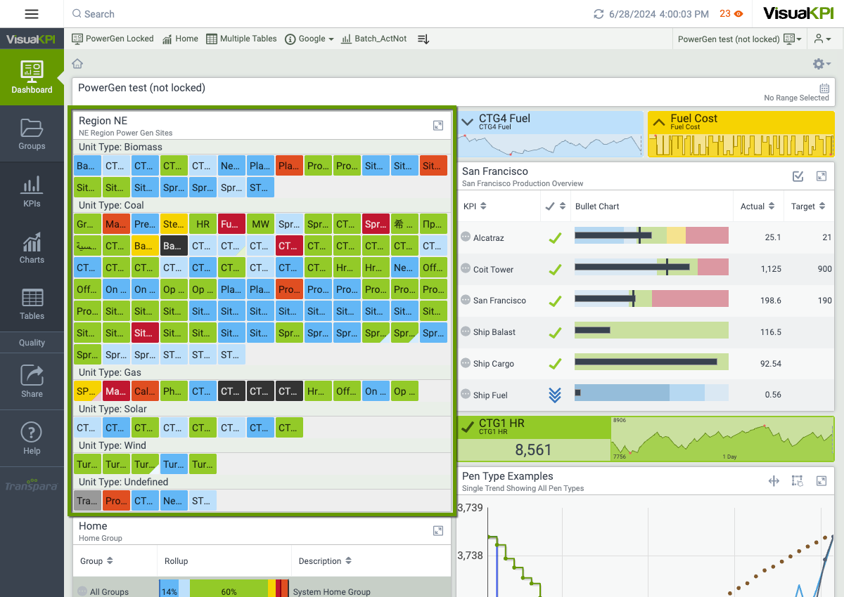 If you want to return to the top-level Group, click on the Home icon () or the Visual KPI logo in the navigation menu. If you are in the KPI, Charts, or Tables tab, clicking on the Group tab will take you to the group level of the object you are viewing.