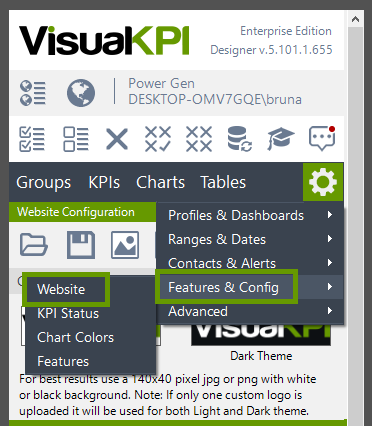 The light theme is the standard for every new instance of Visual KPI. However, you can set up the dark theme as the default for your website by selecting it in the Default Color Theme line on the Value column. You can also change whether users can change the theme for themselves in the Allow Users to Change Color Theme line.